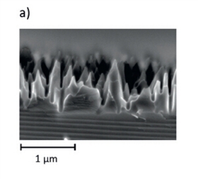 黑硅表面有納米級小山峰,反射率很低。通過優(yōu)化反應(yīng)離子刻蝕(RIE)工藝的參數(shù)來制作黑硅,由于其在很寬的波段范圍內(nèi)反射率都很低且接受角廣而備受關(guān)注。除了RIE還有其他制作黑硅的方法,如激光制絨、金屬催化濕化學(xué)刻蝕、等離子體浸沒離子注入等。黑硅在太陽能電池應(yīng)用中的一個(gè)難題是黑硅表面面積增大而導(dǎo)致表面復(fù)合速率增大,進(jìn)而造成短波段的光譜響應(yīng)變差。黑硅已經(jīng)被廣泛應(yīng)用到P型電池上,通過熱氧化和沉積SiNx作為正面鈍化層。但是低反射率的增益無法彌補(bǔ)高表面復(fù)合速率的影響,電池效率較低,效率最高可達(dá)到18.2%。