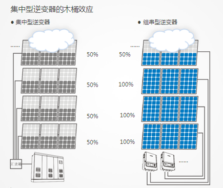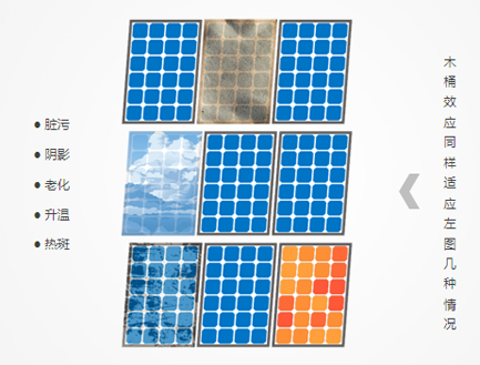 第一,避免了集中型逆變器電站的木桶效應(yīng)(如下圖)。集中式并網(wǎng)逆變系統(tǒng)中,組件方陣經(jīng)過兩次匯流到達(dá)逆變器,逆變器最大功率跟蹤功能(MPPT)不能監(jiān)控到每一路組件的運(yùn)行情況,因此不可能使每一路組件都處于最佳工作點(diǎn),當(dāng)有一塊組件發(fā)生故障或者被陰影遮擋,會影響整個系統(tǒng)的發(fā)電效率。所以當(dāng)電池組件受到遮擋時,集中型電站會受到較大的影響,組串型電站只有被遮擋的一串對應(yīng)的一路MPPT受到影響。而正常情況下,各個組件之間的安裝間距,安裝角度各異,一天中一定時間內(nèi)不可避免會產(chǎn)生局部遮擋,特別是早晚時刻太陽高度角較低的時候,或者出現(xiàn)一些植被遮擋一些電池片。若一個500KW方陣的電池板使用一路MPPT來跟蹤,會損失一定的發(fā)電量。該情況同樣適用于當(dāng)電池組件發(fā)生臟污、陰影、老化、升溫、熱斑的情況下。